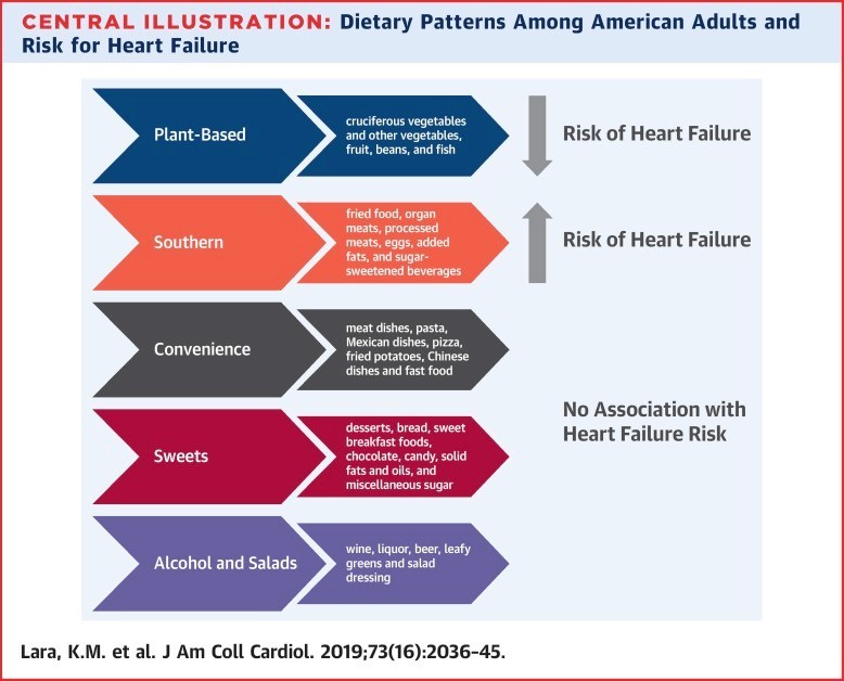 - On the other hand adherence to the Southern dietary pattern was associated with a 72% higher risk of incident heart failure (although the association was attenuated after adjusting for potentially confounding factors like obesity (BMI, WC), hypertension, dyslipidemia, DM, AF, albumin-to-creatinine ratio, and eGFR.
