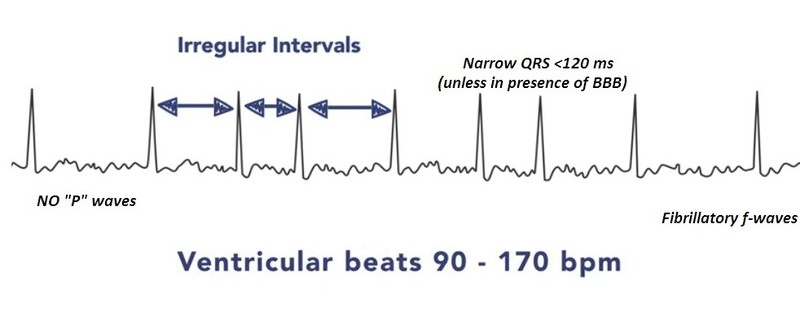 - QRS complexes are typically fewer than 120 ms unless there is a pre-existing bundle branch block, auxiliary route, or rate-related conduction abnormality.