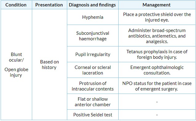 - If an open globe rupture is suspected, a protective cover should be taped over the wounded eye to prevent additional disruption of the surrounding tissue. An ophthalmologist should be contacted immediately.