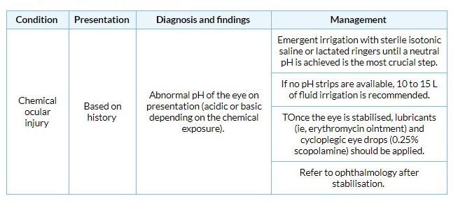 - Irrigation after a chemical splash should be undertaken before formal admission to the emergency room and prior to any additional ocular assessment or consultation with an ophthalmologist.