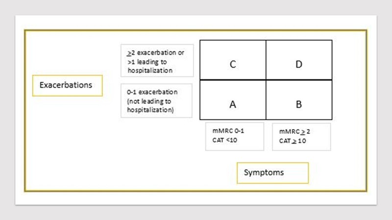After a thorough assessment of clinical details, COPD patients should be classified in ABCD scheme as per their level of symptoms and number of exacerbations. As per the category, treatment should be initiated as described below in Figure 2 (GOLD guidelines). From group A to D severity of illness rises and thus the revision is warranted.