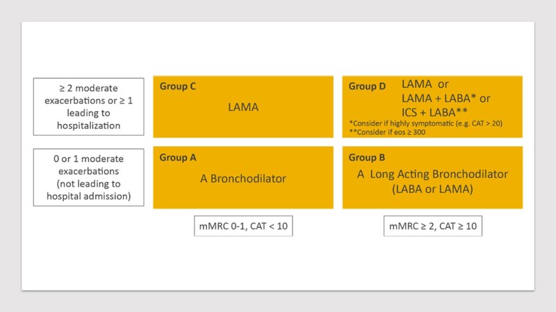 - In Group D (more symptomatic with mMRC>2 and have more risk of exacerbation i.e. >2 moderate exacerbation or >1 requiring hospitalisation), therapy should be started with LAMA monotherapy. However, if the patient is found to be overtly symptomatic, a combination therapy (LABA and LAMA) should be considered. In a subset of patients, where there has been a past or concomitant history of asthma, blood eosinophil counts >300 cells/ul, inhaled corticosteroids should be considered as a combination with LABA. Risk of pneumonia with ICS should always be borne in mind which is a known complication with regular use of ICS.