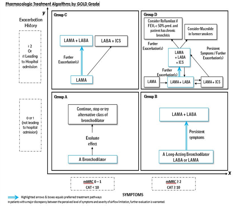 Pharmacotherapy is prescribed based on the severity of COPD. This is called combined assessment scoring based on symptoms and exacerbations.
