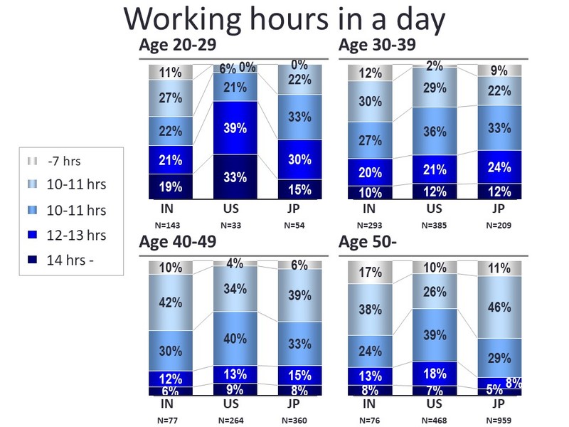 Of all three countries surveyed, Indian doctors seem to be at work the most number of days in a week, but US doctors seem to work the most number of hours per day. Japan was well-balanced in both categories having 5- or 6-day work weeks, showing larger percentages of >12 hours work day only in the first two groups (ages 20 to 29 and 30 to 39) and the same for 8 to 9 or 10 to 11-hour work days across all age groups surveyed.