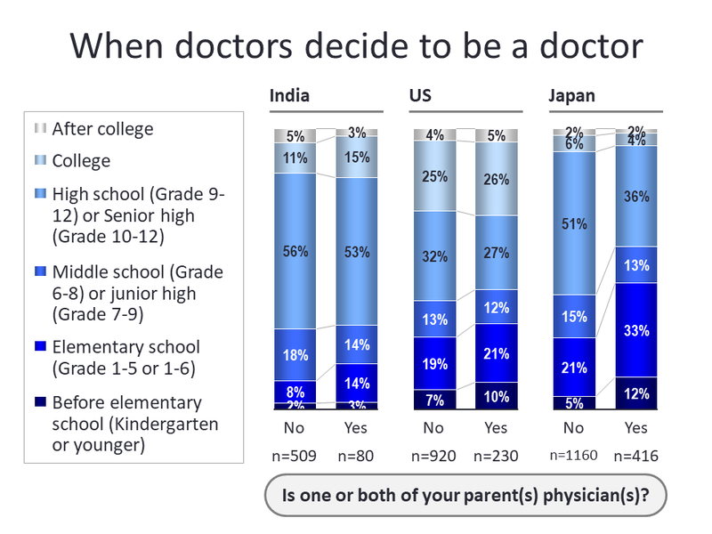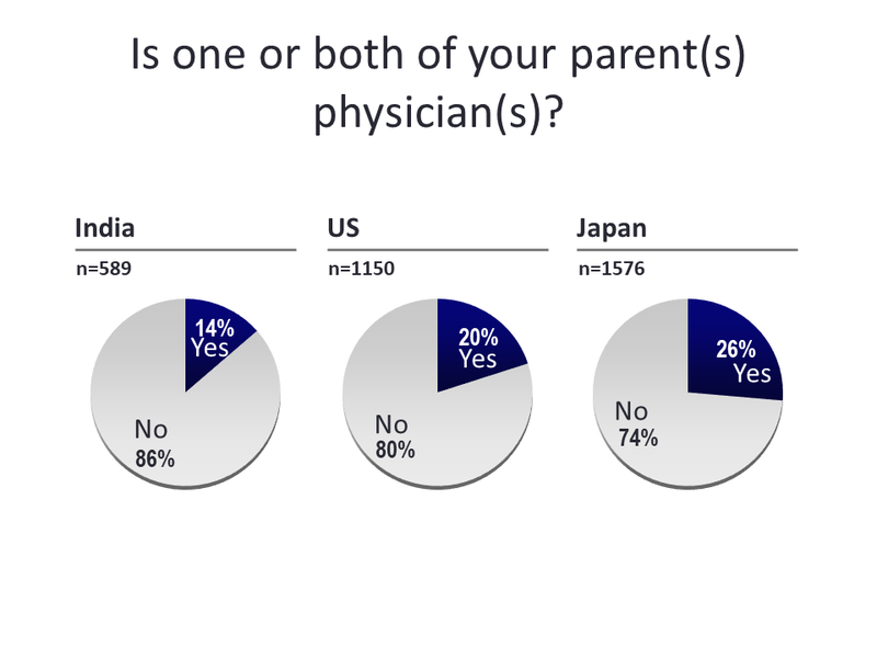 - Most doctors (India, US, and Japan) who participated in the survey did not have physician parents who may have been first-hand influencers of their career choice.