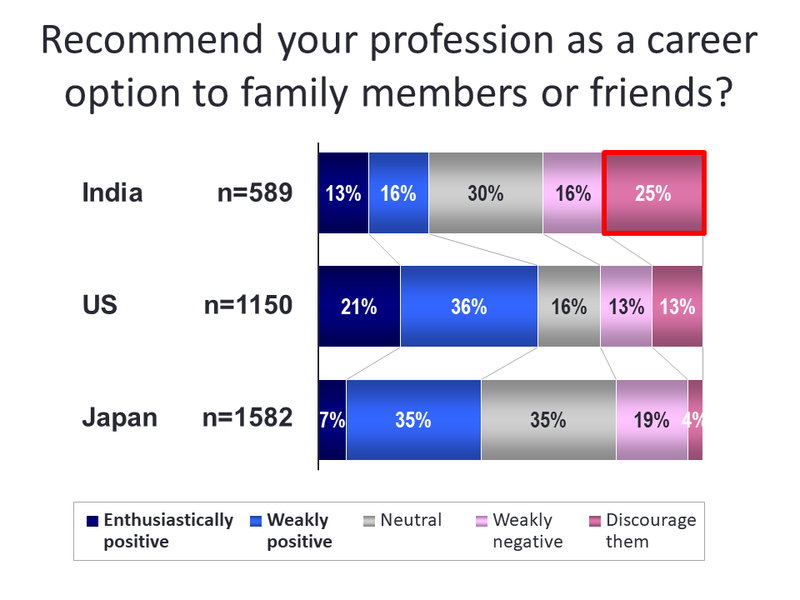 25% Indian doctors mentioned that they would definitely not recommend their profession as a career option to family members and friends. These numbers were quite low for US and very low for Japan.