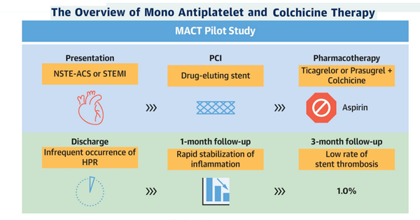 To test this strategy, the Mono Antiplatelet and Colchicine Therapy (MACT) single-arm, open-label proof-of-concept trial was created.