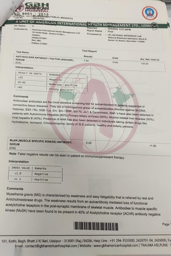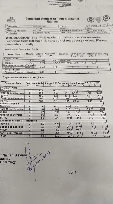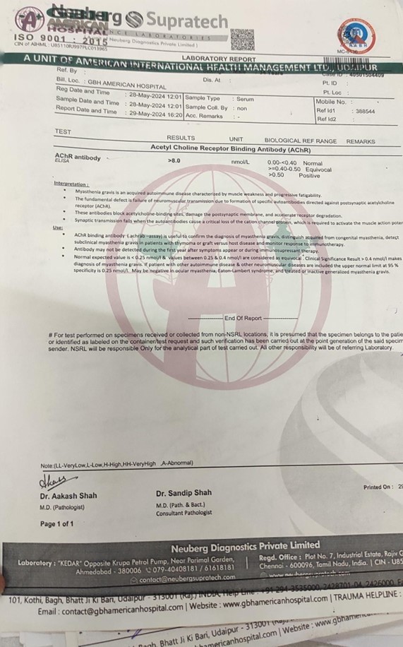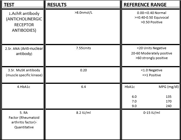 The patient has had CAD in the past and is on statins, dual antiplatelets, and anti-angina drugs. On investigations, positive anti AchR ab was found ( >8 nmol/Lt. normal >0.50).