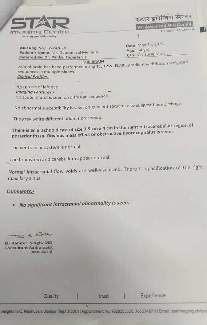 - He was directed to a neurologist and urged to get an MRI Brain provided eye drops.