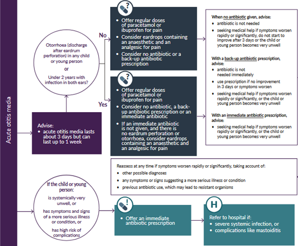 If an initial antibiotic is not administered and there is no eardrum rupture or otorrhoea, consider using eardrops that include an anaesthetic and an analgesic for pain. Evidence shows that decongestants or antihistamines do not alleviate symptoms.
