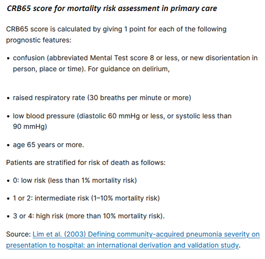 - Low severity - CRB65 score 0 or CURB65 score 0 or 1