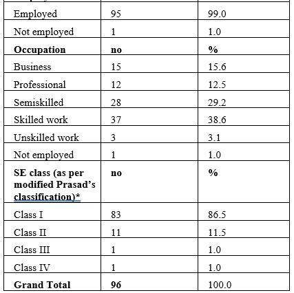 - Two-thirds of patients were working as either skilled workers or in the professional sector or running a business which reflects stressful work life for these patients. Rest were involved in semi-skilled/unskilled work or not working. The majority of the patients belonged to SE class 1 of modified Prasad's classification. (table 2)