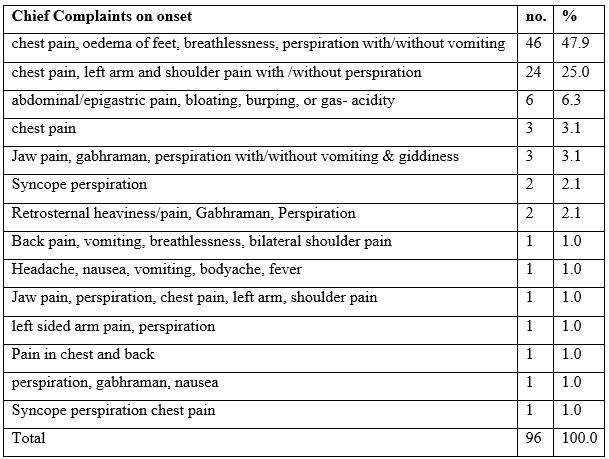 - No other study was found to have details on presenting complaints. In our study, the majority of the patients presented with a symptom complex of chest pain with oedema of feet/ breathlessness/ perspiration /vomiting/ left arm or shoulder pain. (table 3)