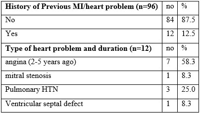 - Of the minority patients who had any history of previous MI/heart problems (12.5%), 58.3% patients had angina attacks (2-5 years ago). (Table 6.1)