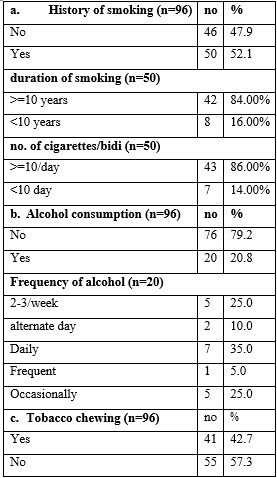 - The majority of the patients had a history of smoking.Smoking was a major risk factor in many other studies also°, [10],[12],[14],[17],[18], Around 15/*TM patients had a history of alcohol consumption.