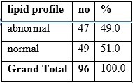 - Nearly half had an abnormal lipid profile. (table 6.3) Abnormal lipid profile can lead to the deposition of cholesterol and lipid in the major blood vessels of the body increasing the risk of thrombo-embolic events predisposing to AMI.