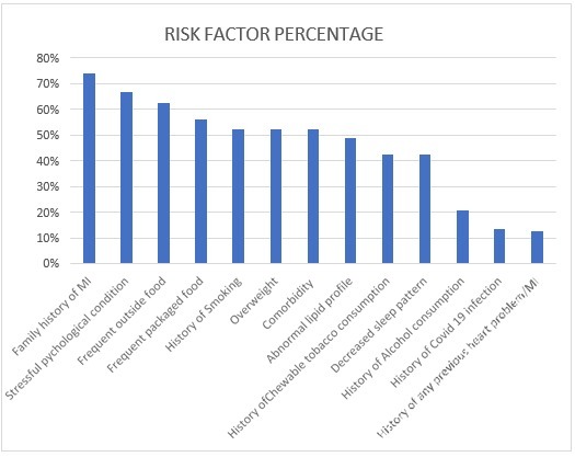 - A positive family history of MI was present in nearly 3/4" of the patients, or 74% (table 6.6). This was the most common risk factor found in our study (figure 3). This indicated a strong hereditary relation of AMI in young. Positive family history as a major risk factor was also mentioned by other studies. [10],[11],[13],[18]