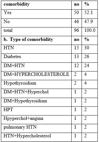 - More than half of the patients had some type of comorbidity, out of which the majority of the comorbid patients had DM or HTN or both that is 80% of the comorbid patients. (table 6.8) These both are proven risk factors for cardiovascular diseases. Other studies have also mentioned DM &HT as common risk factors among the young.? [1],[6]