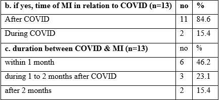 - 13.5% of patients suffered from COVID-19 infection, out of which 84.6% of patients developed AMI after COVID-19 infection. Patients who developed AMI after COVID, most of them developed it within a month of COVID-19.