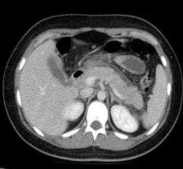 - A computed tomographic scan of the abdomen revealed inflammatory stranding around the tail of the pancreas.