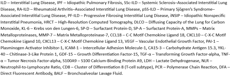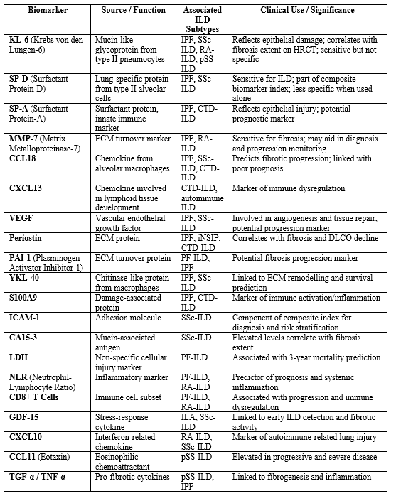 Krebs von den Lungen-6 (KL-6) and surfactant proteins (SP-A and SP-D) remain among the most studied ILD biomarkers. New studies reaffirm KL-6 as a sensitive marker for epithelial injury and fibrosis, with strong diagnostic value in idiopathic pulmonary fibrosis (IPF), systemic sclerosis-ILD (SSc-ILD), and RA-ILD. Yet, KL-6 alone lacks specificity in autoimmune ILDs, where levels may remain normal despite active disease