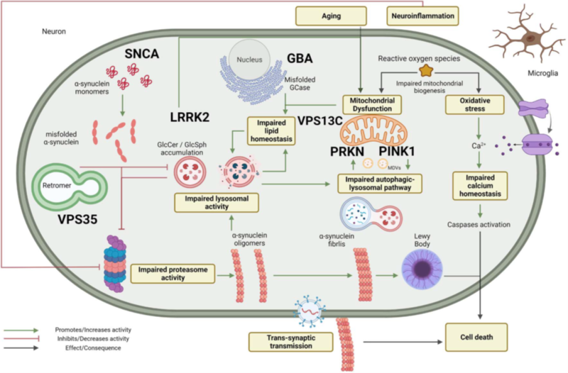 Figure 1: Schematic representation of the pathways involved in the pathogenesis of Parkinson’s Disease and the related genes.