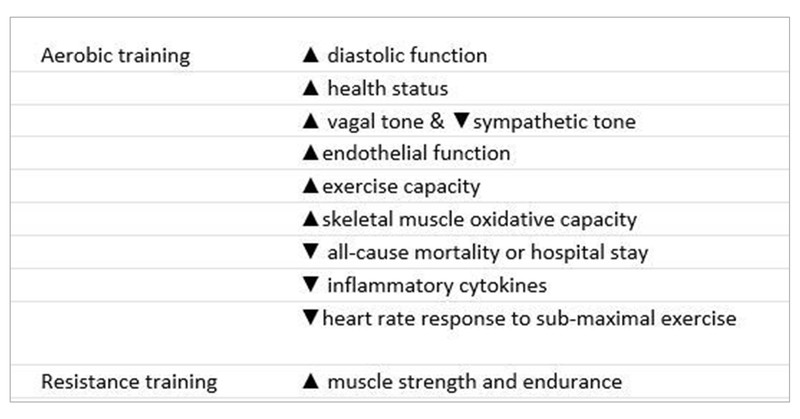 While there is a feeling that exercises may be harmful in patients with heart failure, the reality is that a balanced exercise regimen consistently leads to improvement in exercise capacity, symptoms and quality of life and decreases hospital stay and mortality in these patients. Pathophysiologically, there could be several benefits of exercise on heart failure (Table 1). The benefit has been demonstrated with moderate-intensity exercise (60-70% peak heart rate), although a training effect has also been demonstrated after ≤3 months of low-intensity training (40 to 50% peak VO2).