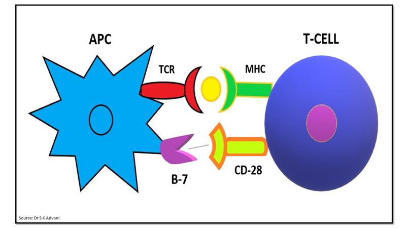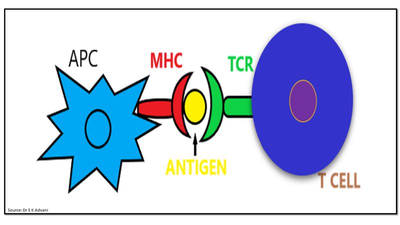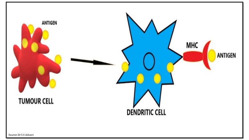 The immune system consisting of cellular and humoral responses recognises and eliminates invading pathogens and neoplastic cells. T cells play a vital role in cell-mediated immunity against cancers. The cancer cell expresses a new antigen on the surface of the cell which is recognised as a foreign antigen. Anti-cancer immune response is a self-propagating cyclic process which is initiated with the release of antigens from a cancer cell. These antigens are captured by antigen presenting cells (APC) such as dendritic cells for processing (Fig.1). Dendritic cells present the processed antigens to T cells by expressing them on their cell surface as major histocompatibility complex (MHC) molecules.