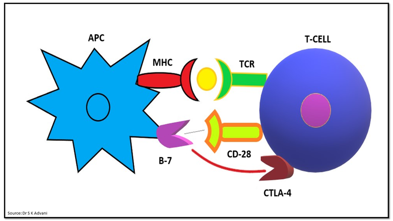 The expression of coinhibitory molecule like cytotoxic T lymphocyte antigen-4 (CTLA-4) with strong affinity for B7 predominantly inhibits T cell activation by competing with the CD28+ costimulatory molecule (Fig.4). CTLA-4 is expressed approximately 48 hours after T cell activation and provides dominant negative signaling. The balance between co-stimulatory and co-inhibitory signals determines T cell status.