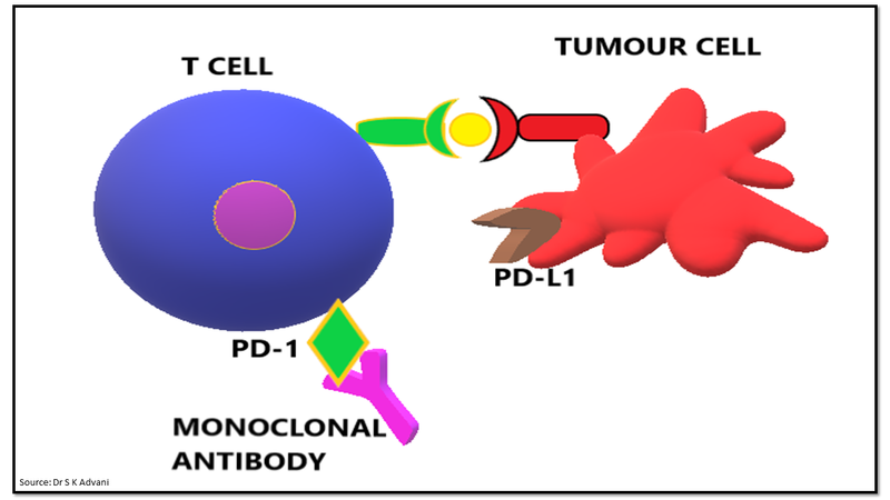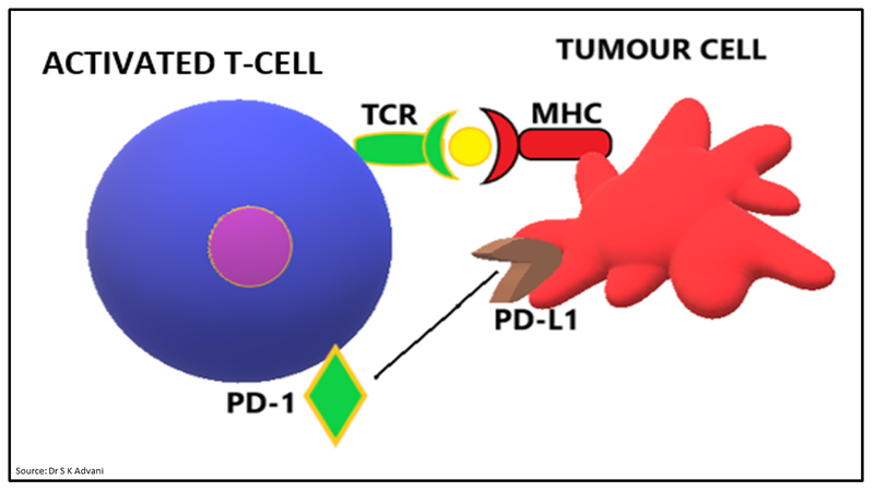 During the effector phase, T-cell receptor interacts with tumour antigen on cancer cells leading to tumour destruction. This interaction leads to the expression of programmed death-1 (PD-1) molecule on activated T cell. Further interaction between PD-1 on T cells with programmed death ligand 1 and 2 (PD-L1/2) on tumour cells works as an inhibitory signal and produce T cell attenuation (Fig.5).