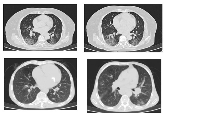 - Ground-glass opacities with multifocal and peripheral or basal distributions