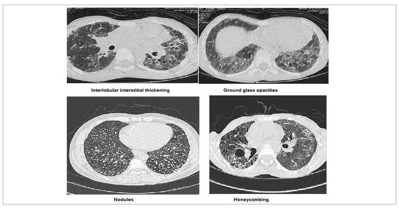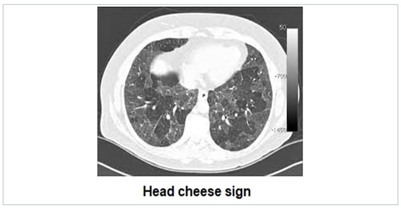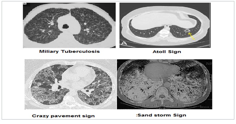 HRCT in ILD is an exhaustive topic in itself. ILD are characterised by interlobular interstitial septal thickening, honeycombing, ground glass opacification and nodules. Idiopathic interstitial pneumonia (IIP) have varied characteristic distribution. Atoll sign is defined as central ground-glass opacity surrounded by denser consolidation and is seen in COP. Sarcoidosis is characterised by fissural nodules and may cause tracheal nodularity. Miliary mottling with randomly scattered nodules in miliary tuberculosis, crazy pavement sign i.e appearance of ground-glass opacity with superimposed interlobular septal thickening and intralobular septal thickening, seen in pulmonary alveolar proteinosis and sand storm sign in pulmonary microlithiasis are some ILD mimics with characteristic CT pattern. The Head Cheese sign consists of juxta-positioning of distinct radiographic areas of low, normal, high attenuation is seen in sub-acute hypersensitivity pneumonitis, sarcoidosis and atypical mycoplasma pneumonias.