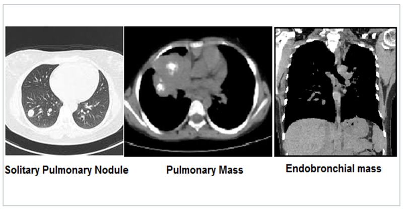 Lung malignancy may also present as a pulmonary mass which are larger than SPN. SPN and masses are described as per size, shape, enhancement, boundaries, calcification, satellite lesions, other lobe, opposite lung, rib, lymph node and pleural involvement. Endobronchial involvement results in a positive bronchus sign. Multiple metastases from a distant malignancy to the lung presents as classical cannon ball metastasis.