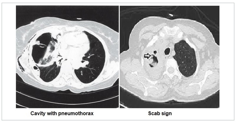 Pulmonary cavity is a thick-walled, air-filled space with or without a fluid level associated with a nodule, mass or consolidation. The spectrum of diseases causing a cavity ranges from infectious, inflammatory, malignant and benign disease processes. While most cavities may be visible on a chest X-ray, cavities that are retrocardiac and apical in nature may be difficult to visualise on a chest radiograph. The cavity may be associated with complications like pneumothorax and hydropneumothorax due to its rupture. The scab sign is characterised by a focal irregular/spiky cavity wall thickening, correlating pathologically with a fibrinopurulent mass and/or blood crust and clinically indicating the site and predisposition to haemoptysis in cavitary pulmonary aspergillosis.