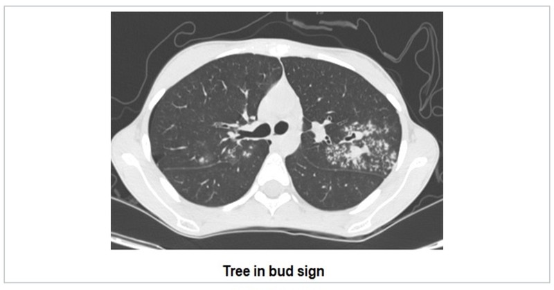 Tree-in-bud sign suggests multiple areas of centrilobular nodules with a linear branching pattern. Initially described in patients with endobronchial tuberculosis, it is now recognised in a large number of conditions again ranging from infections, inflammations, vasculitis to malignancies.