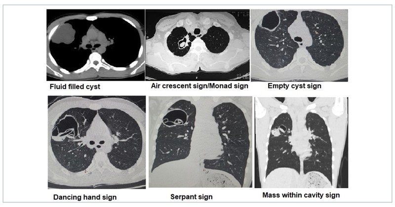 Hydatid cyst has been associated with various CT signs. An unruptured hydatid cyst may appear as a fluid filled cyst. Post rupture or aspiration the hydatid cyst can appear as air crescent sign, water lily sign/Camalote sign, crumpled membrane sign/dancing hand sign, empty cyst sign, serpant sign, or mass within cavity sign.
