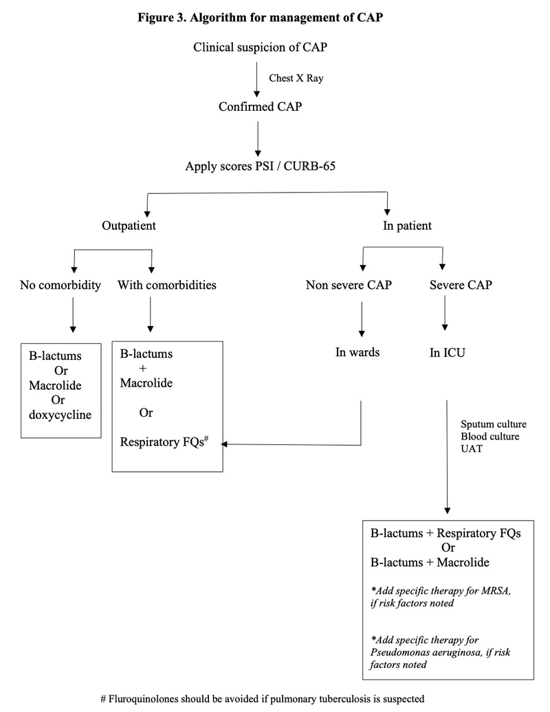 Management of CAP can be done either in ambulatory settings or in hospital settings. Pneumonia severity index (PSI) and CURB-65 are two tools which were devised for prognostication. [11,12] However, in the current scenario they serve in deciding whether the patient can be sent home on treatment or needs hospital care.