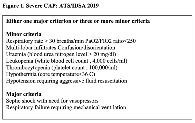 Special sounds associated with pneumonia are whispering pectoriloquy, egophony etc. Signs of hypoxemia can be evident depending upon extent of gas exchange abnormality. Severe grade of CAP is a major concern as defined in figure 1. In severe CAP, due to intense systemic inflammatory response all over, high ESR, C-reactive protein, ventilatory embarrassment requiring support, hypotension, altered sensorium and organ dysfunction can be seen.