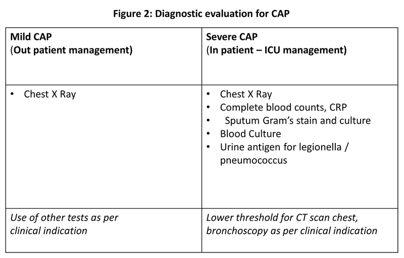 Diagnosis of CAP is done with an opacity on chest X-ray and a clinical prodrome as mentioned above. For clinically stable patients, a basic chest X-ray is enough for diagnosis and initiation of empirical treatment. There are many supportive investigations which can be done as per the clinical scenario like complete blood counts, C-reactive protein, procalcitonin, sputum evaluation with gram stain and aerobic culture, CT scan etc. Decision for these tests depends upon the severity of illness and overall clinical scenario (Figure 2). When influenza viruses are circulating in the community, respiratory sample should be tested for influenza virus with a rapid influenza molecular assay (i.e., influenza nucleic acid amplification test), which should be preferred over a rapid influenza diagnostic test (i.e., antigen test).