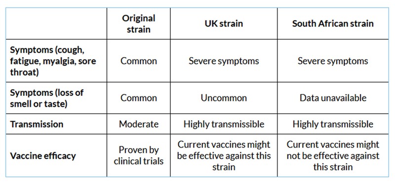 The table presented below gives a comparative analysis between the original COVID-19 strain and the newly emerged strains: