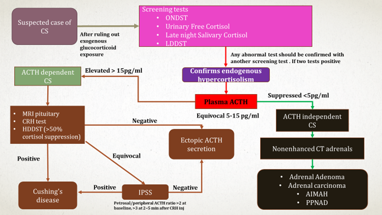 - High Dose Dexamethasone Suppression Test (HDDST) and Corticotrophin-Releasing Hormone (CRH) Stimulation Test help in the diagnosis of ACTH Dependent CS due to pituitary causes.