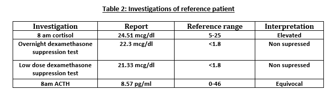 - Plasma ACTH – Detectable or high levels (More than 15pg/ml) suggest ACTH-dependent CS whereas ACTH will usually be suppressed (Less than 5pg/ml) in ACTH-independent causes.