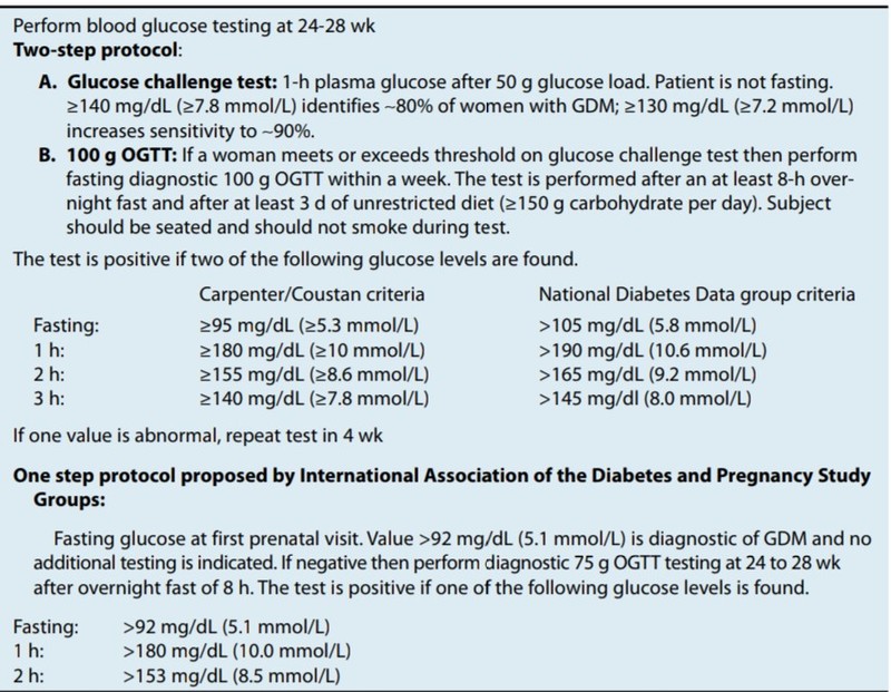 It should be performed between 24 and 28 weeks in those women not known to have glucose intolerance earlier in pregnancy. This evaluation is usually done in two steps. In the two step procedure, a 50 g oral glucose challenge test is followed by a diagnostic 100 g oral glucose tolerance test (OGTT) if initial results exceed the recommended plasma glucose concentration.