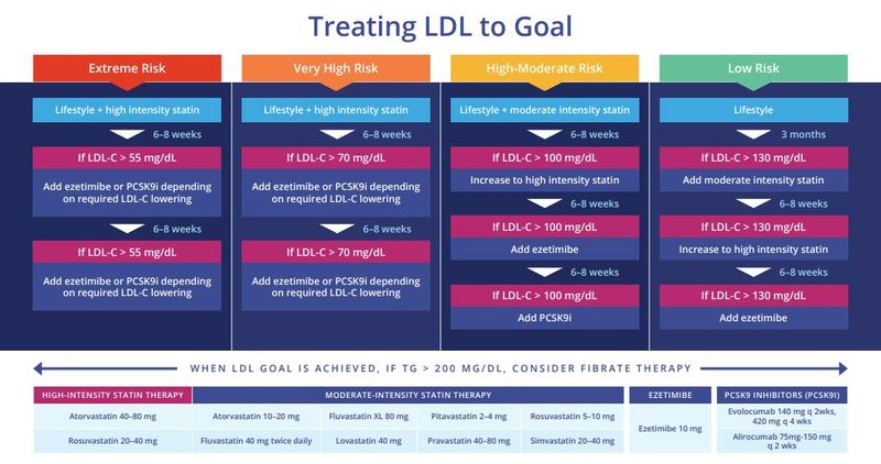 - Patients with extremely high risk (progressive ASCVD, coronary artery disease with CKD stage 3-4, diabetes or heterozygous familial hypercholesterolemia, history of premature ASCVD in females age < 65 or males with age < 55 years) should be treated for LDL targets of < 55 mg/dL.