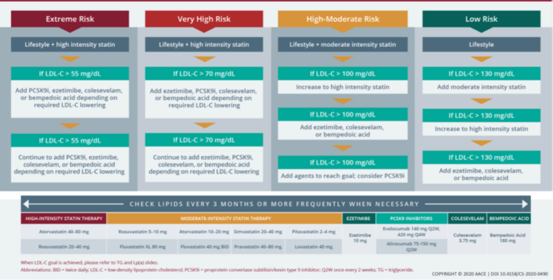 - Patients with extremely high risk (progressive ASCVD, coronary artery disease with CKD stage 3-4, diabetes or heterozygous familial hypercholesterolemia, history of premature ASCVD in females with age < 65 or males with age < 55 years) should be treated for LDL targets of < 55 mg/dL.