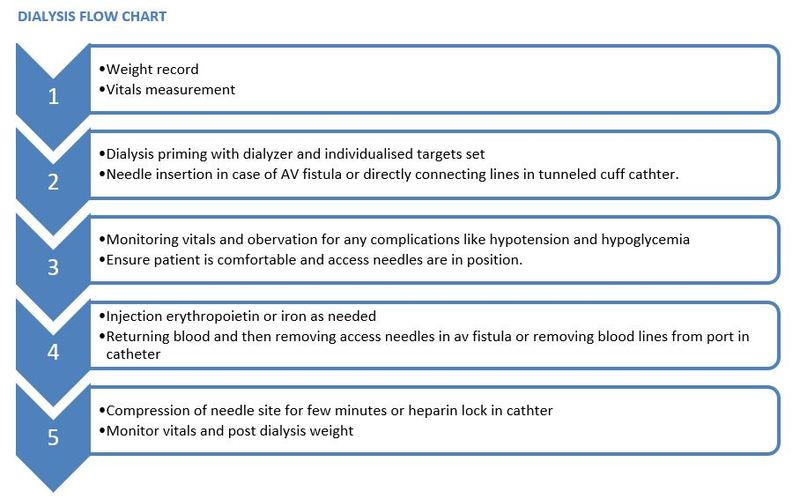 The dialysis technician performs the dialysis treatment and monitors patients throughout, while biomedical technicians maintain the machines and water quality at the dialysis centre. The vascular access care team includes a vascular access surgeon who creates and maintains access to dialysis. The patient can sit and work on a laptop, eat food and watch television during the HD session. A record is maintained which includes the patient’s history, diagnosis, and weight record with inter-dialysis weight gain, blood reports and medications.