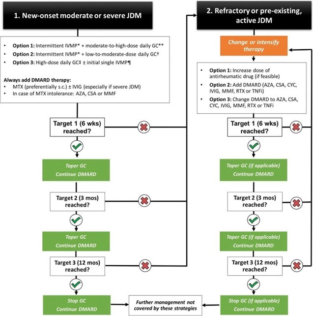 Diagnosis: She was diagnosed with JDM and treated with steroids and immunosuppressive medications, which improved her symptoms. However, she experienced multiple disease flares over the next few years, with worsening muscle weakness and skin rash.