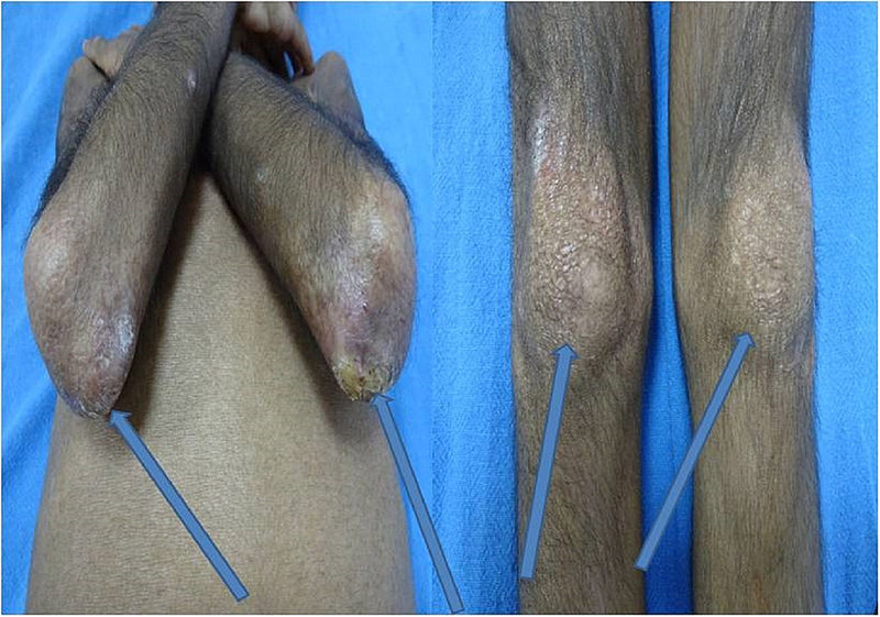 - Thickened erythematosus and scaly rash over palm - Mechanics hand
