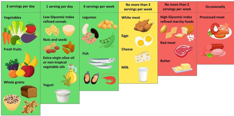 - With regards to cereals, a piece of unique advice is offered based on the glycaemic index (GI), with meals with a high GI causing blood sugar to rise more quickly than those with a low GI. As foods with a high glycemic index (i.e. white bread, white rice) are related to an increased risk of atherosclerosis, intake should be limited to two servings per week and otherwise substituted with whole-grain meals (i.e. bread, rice, oat, barley) and low glycemic index foods (i.e. pasta, parboiled rice, corn tortilla).