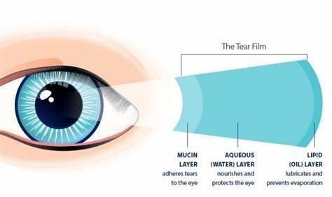 The lipid layer derives from the meibomian glands and traps the aqueous tear film on the eyeball and protects it from rapid evaporation. Meibomian gland dysfunction, or posterior blepharitis, produces dry eyes from rapid evaporation of tears; it often accompanies aqueous tear deficiency and can be an aggravating factor in patients with keratoconjunctivitis sicca that requires additional therapy.